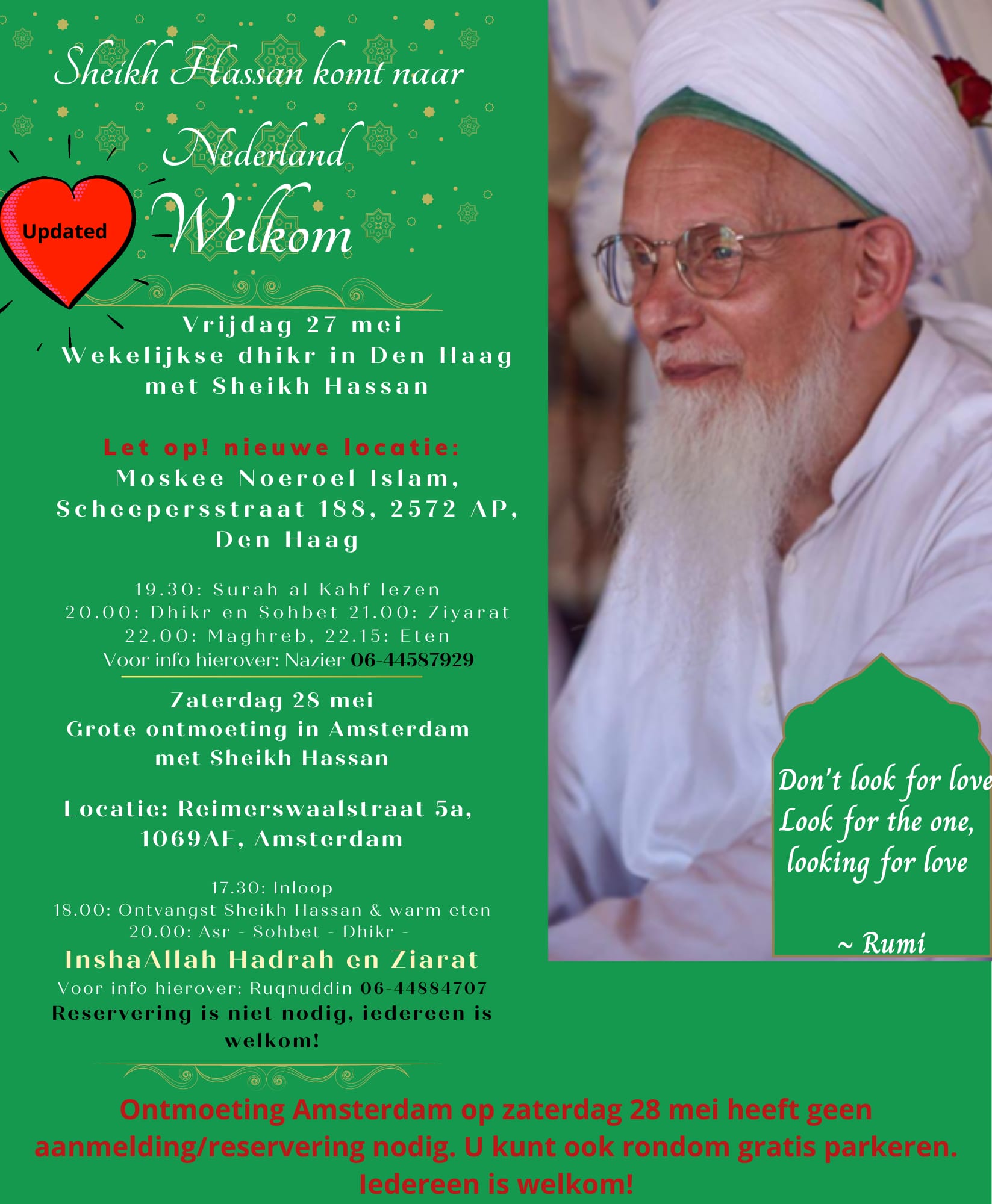1. Wegens groter aantal aanmeldingen dan verwacht wordt de dhikr met Shaykh Hassan Dyck op een nieuwe locatie gehouden: moskee Noeroel Islam in Den Haag heeft hun gebedsruimte voor ons geopend!