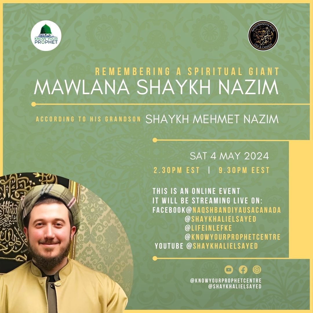 Assalamu alaikum, *”With the remembrance of the righteous ones, mercy descends.”* As we come close to the commemoration of the 10th Urs of Mawlana Shaykh Nazim, Join Shaykh Mehmet Nazim as he reflects upon the time he spent in the company of his grandfather. The broadcast will be an intimate look at some aspects of the private and public life of Mawlana Shaykh Nazim, as it was experienced by shaykh Mehmet Nazim, who grew up under his gaze. Shaykh Ali Elsayed will be conducting the online event.