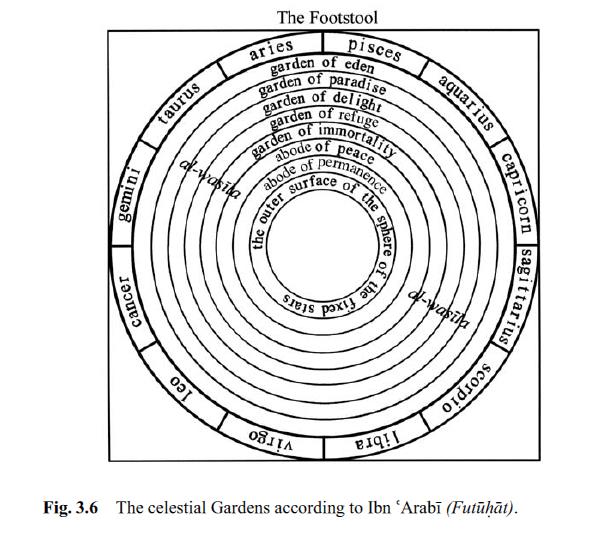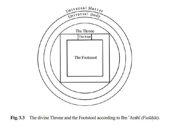 In Islamic cosmology, this was achieved by distinguishing the spatio-temporal modality of the Throne and Footstool from that of heaven and earth. Through his intricate structure and a double movement scheme, Ibn ‘Arabi was able to maintain that space and time already existed before the creation of heaven and earth, and that a day as a measuring unit was also differentiated in time by reference to the position of the divine Feet on the Footstool. This is a divine day, of course, as in “a day with God is as a thousand years of what you reckon” (22:47).
