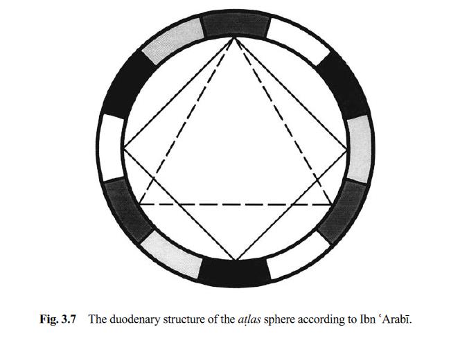 In Ibn ‘Arabi’s cosmological scheme, the atlas sphere with the rock as its center, imagined independently of the planetary skies, gives the image of an all-encompassing sphere that represents space as an undifferentiated totality.