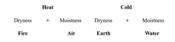 Nature’s two active principles are heat and cold. Heat causes dryness, and cold causes moistness. Dryness and moistness are thus passive outcomes in relation to heat and cold. They are also in opposition just as are heat and cold. Heat negates cold, and dryness negates moistness; hence they cannot naturally mix. Their contrasting qualities, however, enable a particular pattern of productive synthesis, wherein quadrature remains the underlying order. Active and passive forces of Nature join in four possible combinations only, producing the four natural elements: fire, air, earth, and water.