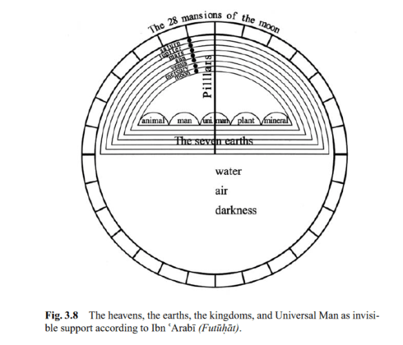 In his diagram of the corporeal world, Ibn ‘Arabi depicts the form of the Universal Man by the form of the axis mundi—al-‘amad that “you cannot see” (13:2)—without which the vault of heaven would collapse.