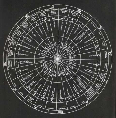 Note: Ibn al-’Arabi’s Cosmology of the Letters. A comological chart created by Titus Burckhardt to describe Ibn al-’Arabi’s mystical interpretation of the Arabic letters as corresponding to Quranic names of the Divine. Each letter represents a particular attribute and cosmic reality. From Laleh Bakhtiar’s Sufi: Expressions of the Mystic Quest (New York: Thames & Hudson, 1976), 62. Image used with permission.