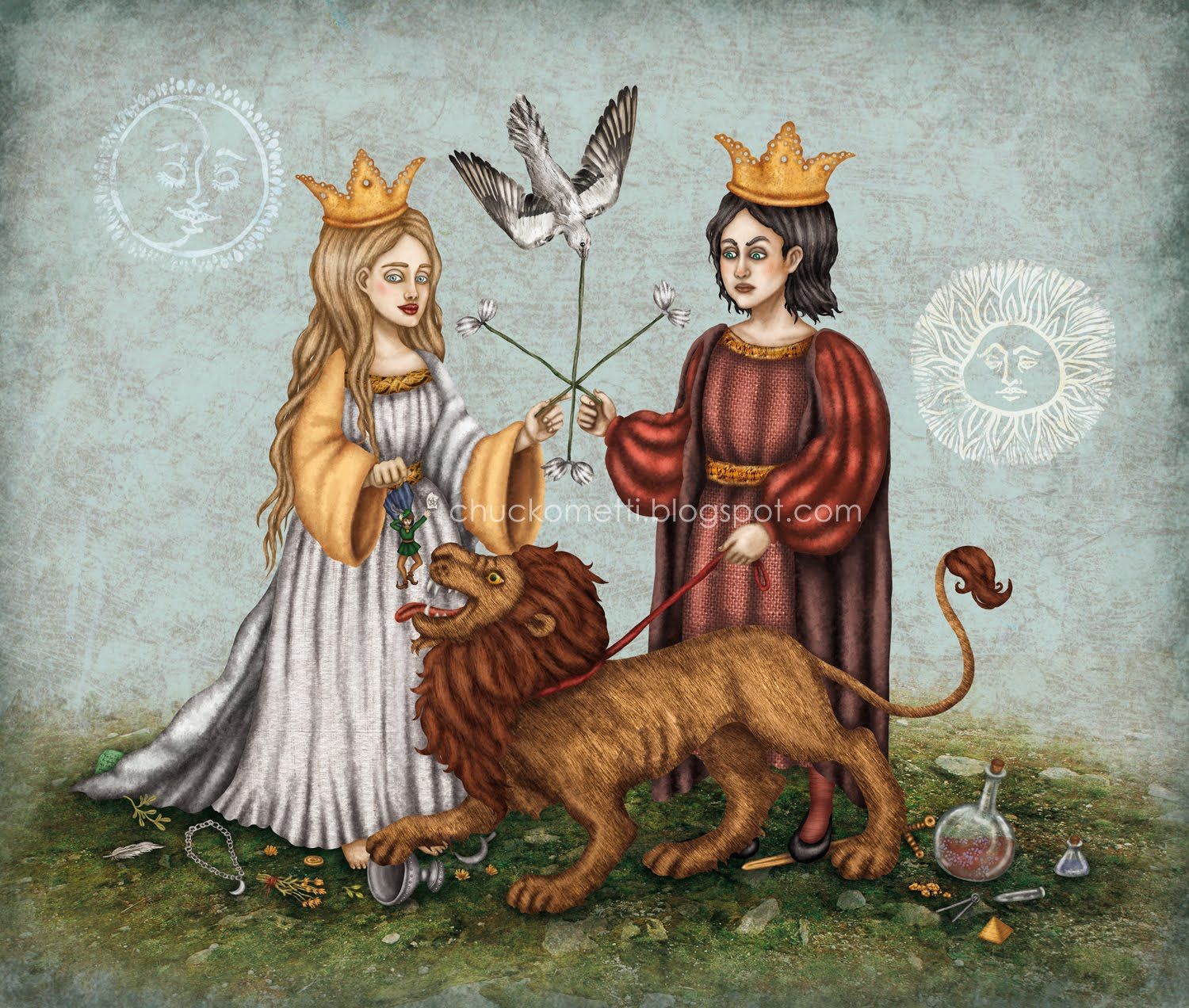 The King and Queen, a common symbol in alchemical iconography, represent Sulfur and Quicksilver, Spirit and soul—or, on the purely spiritual level, the union of Shiva and Shakti, the Divine Subject as absolute Witness and the Divine Object as universal manifestation in the mode of power. The union of Subject and Object posits the spiritual Center, another symbol of which is the Heart, which is the “center in the midst of conditions,” just as the King and Queen are in the center of “a company more.” Those “before” have the King and Queen behind them, out of their field of vision, as their unconscious motivating force, and are proceeding on foot; these are the psychics (referring not to people who read minds and tell fortunes, but to those whose understanding is limited to the psychological level)—the religious exoterics. Those “behind” the King and Queen have them in plain view, and are aristocratically mounted, symbolizing their transcendence of and control over their lower selves; these are the esoterics, the gnostics or pneumatics. And on another level, the King and the Queen are the Grace and Wisdom of God that simply carry us along, the hidden power that moves behind all the hard, trudging work of being good.