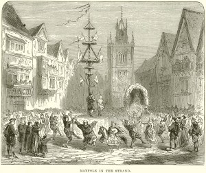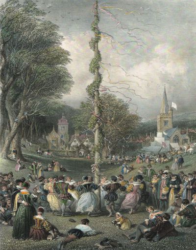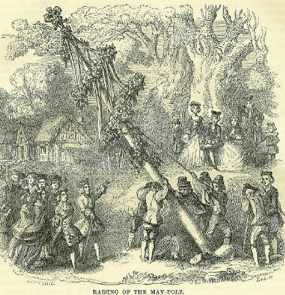 Romance was in the air, but the youths also would gather flowers, boughs of newly flowering hawthorn or blackthorn, and a tree trunk for the Maypole to be erected the next day.