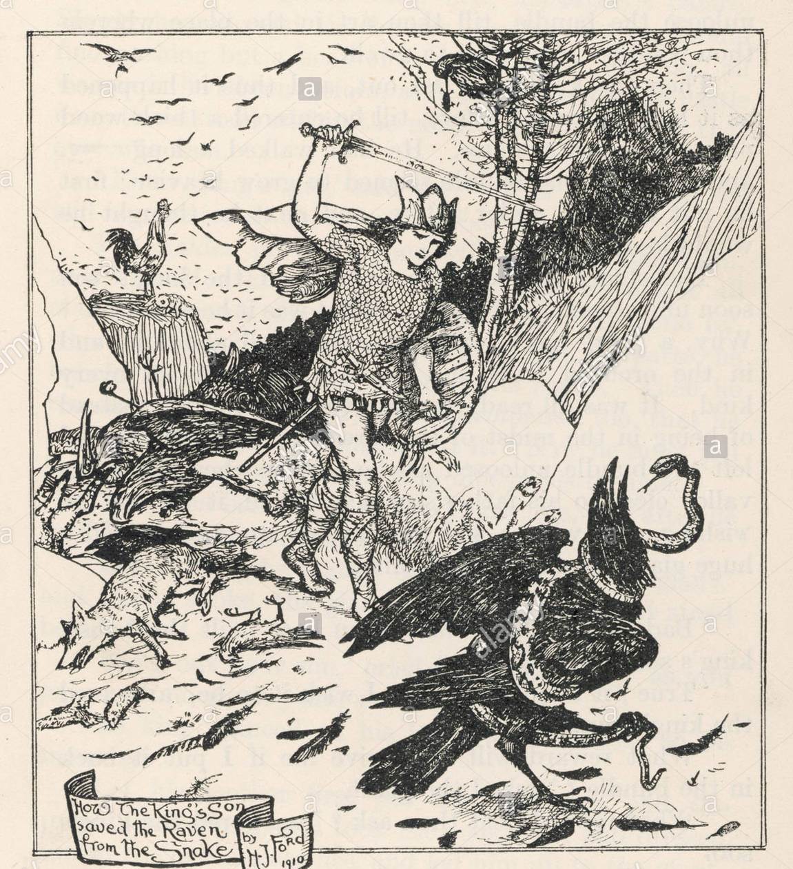 In the Scottish fairy tale ‘the battle of the birds’ there is also a king’s son in love with the daughter of a giantess. He too is given impossible tasks that he does clear with the help of the giantess. Eventually he has to climb a tree without lateral branches (compare the pole) to give the giant eggs that are in a nest there. This is only possible by sacrificing the daughter herself. By killing her, he can make a kick from her bones and reach the top of the tree. Once again below he collects the bones and the daughter of the giant comes back to life. Of course he eventually marries her. You could say that he sees through and kills her outer appearance and so, by continuing to penetrate more and more into her being, she can climb higher into the tree in order to reach the eggs of fertility and creativity.