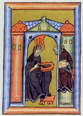 During her lifetime, Hildegard of Bingen was famous for her visions that she had published in her mystical & theological works, Liber Scivias, Liber Vitae Meritorum and Liber Divinorum Operum. – Known as the German Prophetess (Prophetissa Teutonica), she perceived herself as the Trumpet of God called to denounce the social and political state of her time. Thus, she did not merely admonish nun and monks but also pope and emperor. – Hildegard was a seeing listener and a listening seeress. Her visions were at once auditions in which she perceived the voice of God, heard the music of the angels and gained insight into the secret of God (Vision of Trinity), the position of the human being in the cosmos and the history / herstory of God with humankind – from creation to incarnation up to the Last Judgement. ( Hildegard von Bingen 1098-1179)