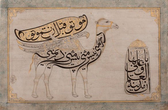 The popularity of the theme is such that painters-miniaturists and calligraphers Alevis-Bektachis seize it. Ali’s camel – but never the horse of Haci Bektas – is represented in various forms and on various supports (paper, wood, glass, etc.). The contours of the animal and of the chainer are sometimes traced with the help of Arabic letters and certain formulas, in the same language, and are inserted in the drawings. The injunction “Die before dying” (mutu qabla an-tamutu) usually appears on the coffin.