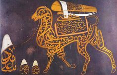 An artist even represented the camel driver in 1894-1895 in the form of an upright gravestone”. In accordance with ancient texts devoted to the theme, there is the fabulous sword of Imam fixed on a camel’s temple. Other well-known Shi’ite formulas take place on calligraphic planes, such as the prophetic tradition: “I am the city of knowledge, and ‘Ali is the gateway to it’ or a futuwwa’s formula: “There are no other heroes than `Ali and no other sword than Dhul-Falcár ‘.