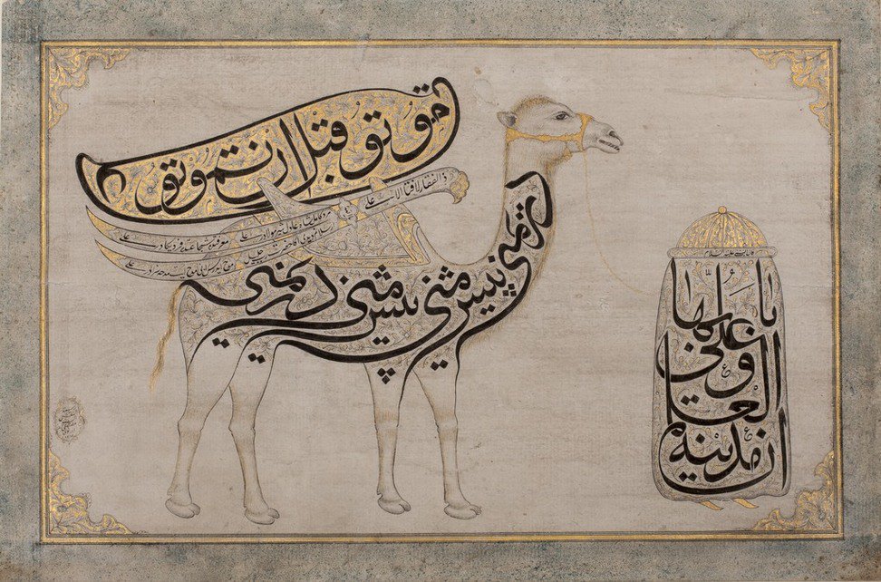 The popularity of the theme is such that painters-miniaturists and calligraphers Alevis-Bektachis seize it. Ali’s camel – but never the horse of Haci Bektas – is represented in various forms and on various supports (paper, wood, glass, etc.). The contours of the animal and of the chainer are sometimes traced with the help of Arabic letters and certain formulas, in the same language, and are inserted in the drawings. The injunction “Die before dying” (mutu qabla an-tamutu) usually appears on the coffin.