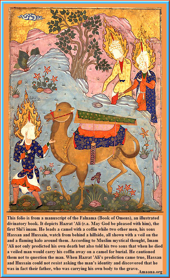 When the caliph ‘AIi, the king of men, falls under the dagger of Ibn Mulcem, his sons, Hasan and Huseyn, took his body to wash him and put him in the coffin. Then appeared a veiled form holding a camel by the bridle. The stranger took the coffin with the body of the Caliph and his sword, Dhul-Falcár, and, loading them on the camel, he went away. Curiously, Hasan ran behind the apparition. The stranger withdrew his black veil and Hasan recognized his father.
