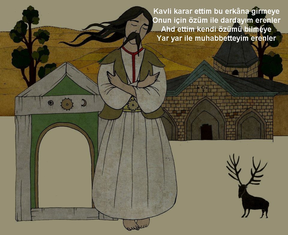 Moreover, according to the Bektashi poets, the idea of transmigration is added to a conception of evolution and involution according to which the saint of the saints travels and adopts the various forms of creation, from unsuitable things (minerals), to animate beings (plants, animals, humans). In the Ottoman Empire, this belief was diffused in the circles of Bektachis through a particular poetic genre called devriye (circle [of creation]). These poems are built on a precise model that allows the poet to tell his changes of form, since his soul is emanated from the Absolute or God until his return to the divine. Several great figures of Alevi-Bektashi poetry, as well as authors related to other Sufi fraternities, have written at least one such poetry; it’s almost an imposed exercise .