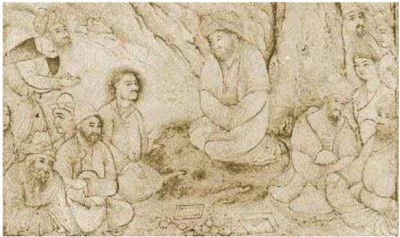 Dervishes sitting beneath a tree. Isfahan, 17th century