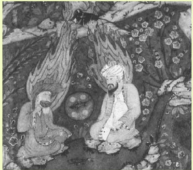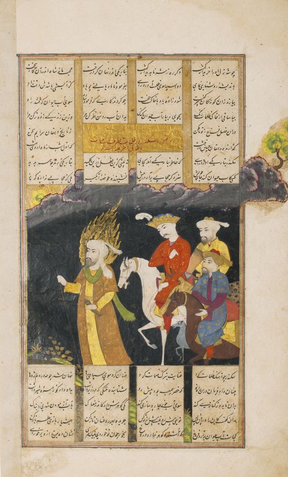 Nizami attributes Iskandar’s failure to his eagerness, whereas in the case of Khizr ‘the Water of Life arrived unsought’, with reference to the fact that it is revealed indirectly by its effect on the fish, when Khizr has no suspicion that he has already reached it.
