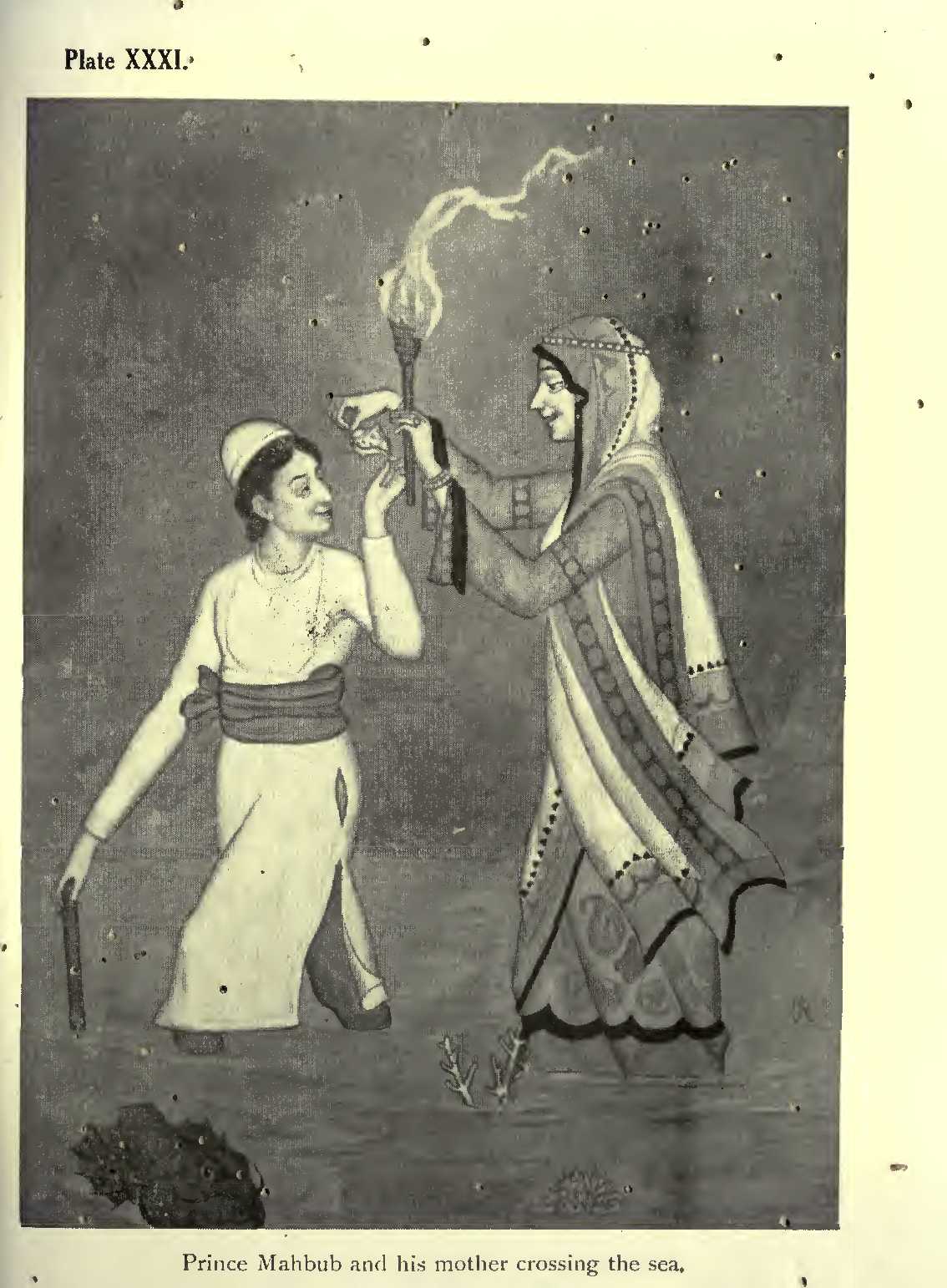 On his return home his mother tells him of his birth, and both set out on their travels in order to avoid the usurper’s suspicion. Mother and son reach a desert land, and there in a mosque beside a mountain they meet a faqir who gives them bread and water that are inexhaustible, and two pieces of wood, one of which can serve as a torch, the other possessing this virtue, that within a radius of fourteen cubits from the place where it is held, the deepest sea will become fordable, and no more than a cubit in depth.