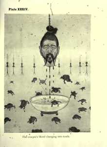 Passing through this he finds himself in a wonderful garden, in which is a palace. In this palace he finds a room in which is a freshly severed head, from which drops of blood are falling into a basin, and are carried out as rubies with the current into the conduit and so to the whirlpool and up into the sea.