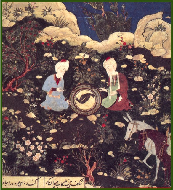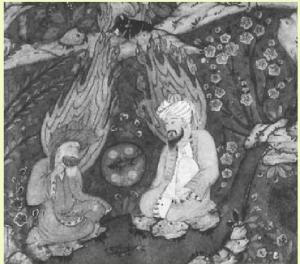 The finding of the Fountain by Ilyas and Khizr occurs in Persian art as the subject of miniatures illustrating the Iskandar Nama.[21] One of these, from a late sixteenth century manuscript belonging to Mr A. Sakisian, is reproduced in colour as frontispiece to his La Miniature persane, 1929, and in monochrome by L. Binyon, Persian Painting, 1933, PI. LXIa; here the two prophets are seated by the Well in a verdant landscape, two fish are seen lying on a platter and a third, evidently alive, is in Khizr’s hand; it is clear that he is pointing out to Ilyas the significance of the miracle. Ilyas is robed in blue, Khizr wears a green robe with a brown cloak.
