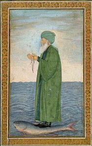 In western Asia, Moslem or Hindu symbolic art shows the Saint, Al Khizr, dressed in a green coat being carried on top of the water by a fish which conveys him over the river of life.