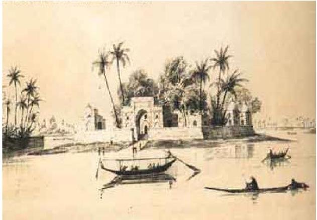 Identified by Jackson as a view of ‘Hajee Ka Tau, an island just above the fort of Bukkur on the Indus’, the sketch would appear to be of the tomb of the river saint Khwaja Khizr, regarded as having been built in 925 A.D. (A.H. 341). According to the legend recorded in the Shachnama, the tomb was built in gratitude by a Delhi merchant Shah Husain who, traveling down the Indus with his pretty daughter on their way to Mecca, was called upon by Dalurai (the Hindu ruler of Alor) to surrender the daughter. In her anxiety to avoid such an impious alliance, the girl prayed to Khwaja Khizr for deliverance and as she and her father sought to escape in a boat, the saint diverted the course of the Indus towards Rohri bringing the harassed father and daughter to safety. Khwaja Khizr, known also as the Jinda or living Pir, is said to be particularly protective of travelers.