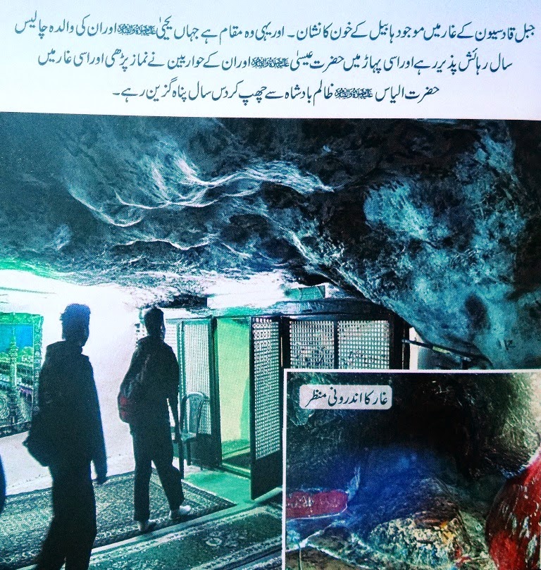 On the slopes of Jabal Qasiun is a cave steeped in legend. It is said to have been inhabited at one point by the first human-being, Adam; and there are various stories told about Ibrāhīm (Abraham), and ‘Īsā (Jesus) also having prayed in it. It is mentioned however in Medieval Arab history books as having been the place where Qābīl (Cain) killed Hābīl (Abel).] It was known for hundreds of years as a place where prayers were immediately accepted, and especially in times of drought rulers of Damascus would climb to the cave and pray for rain. Because of the murder that took place there, claimed to be the first committed, it is called Maghārat al-Dam (the Cave of Blood).