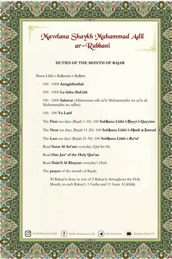 As-Salāmu ‘Alaykum wa Raḥmatullāhi wa Barakātuh. A‘ūdhu Billāhi Minash-shayṭāni r-rajīm. Bismillāhi r-Raḥmāni r-Raḥīm. Wa ṣ-Salātu wa s-Salāmu ‘alá Rasūlinā Muḥammadin Sayyidi l-Awwalīna wa l-Akhirīn. Madad yā RasūlAllāh, Madad yā Sādāti Aṣḥābi Rasūlillāh, Madad yā Mashāyikhinā, Dastūr Mawlana Sheikh Abdullāh al-Fā’iz ad-Dāghistāni, Sheikh Muḥammad Nāẓim al-Ḥaqqānī. Madad.