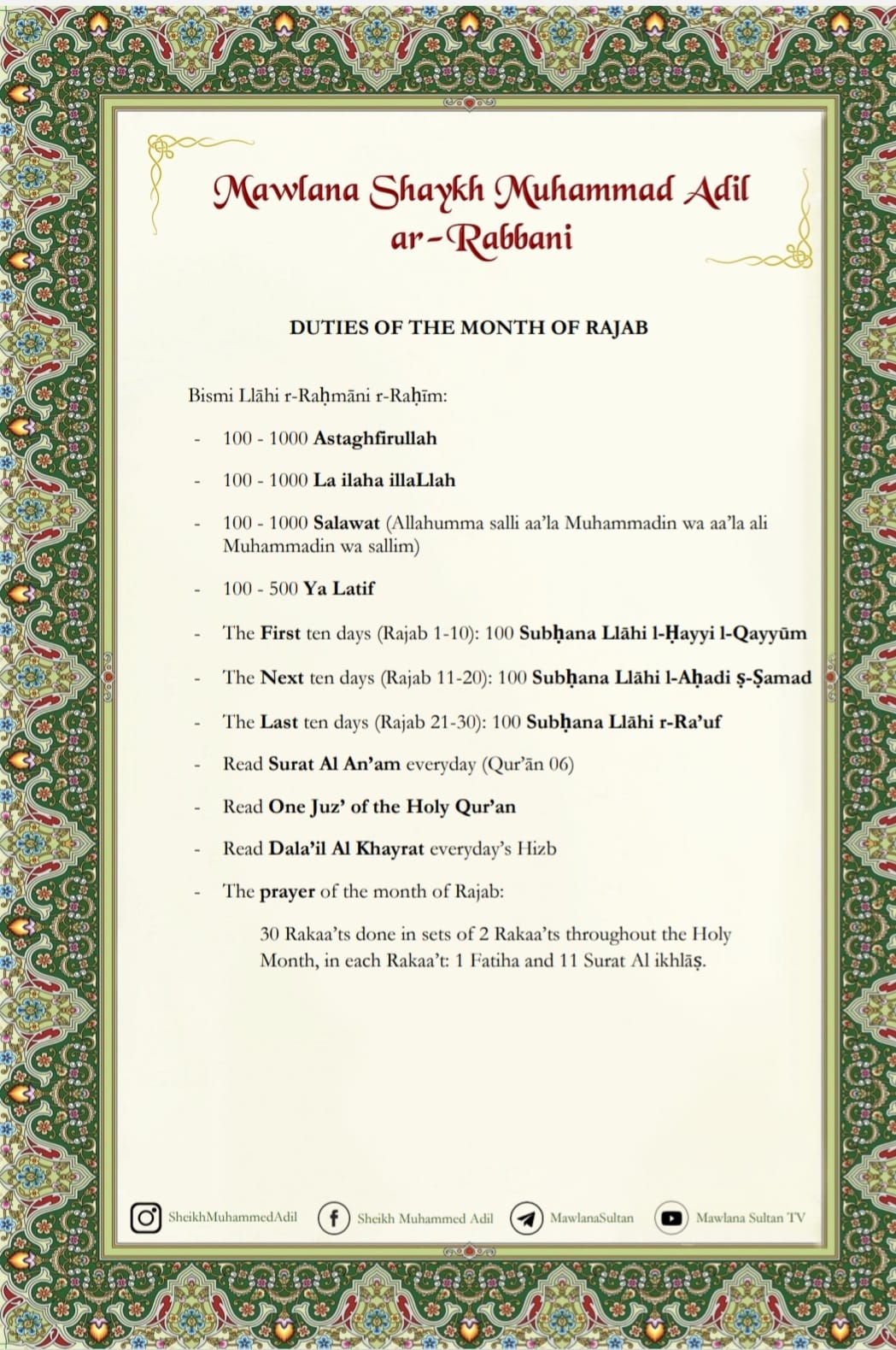 As-Salāmu ‘Alaykum wa Raḥmatullāhi wa Barakātuh. A‘ūdhu Billāhi Minash-shayṭāni r-rajīm. Bismillāhi r-Raḥmāni r-Raḥīm. Wa ṣ-Salātu wa s-Salāmu ‘alá Rasūlinā Muḥammadin Sayyidi l-Awwalīna wa l-Akhirīn. Madad yā RasūlAllāh, Madad yā Sādāti Aṣḥābi Rasūlillāh, Madad yā Mashāyikhinā, Dastūr Mawlana Sheikh Abdullāh al-Fā’iz ad-Dāghistāni, Sheikh Muḥammad Nāẓim al-Ḥaqqānī. Madad.