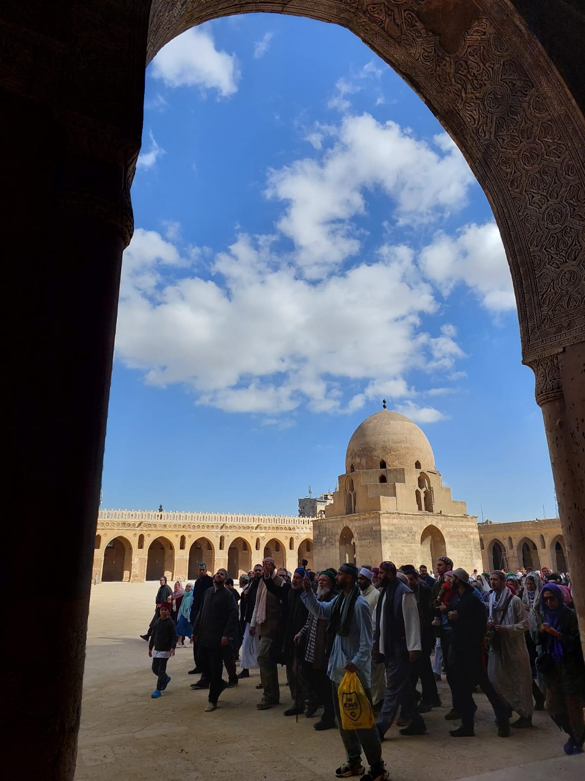 The Mosque of Ibn Tulun (Arabic: مسجد إبن طولون, romanized: Masjid Ibn Ṭūlūn) is located in Cairo, Egypt. It is one of the oldest mosques in Egypt as well as the whole of Africa surviving in its full original form, and is the largest mosque in Cairo in terms of land area. It is built around an open square courtyard which allows natural light to travel through. Ibn Tulun Mosque features ancient architecture styles of Egypt, its decorations being created from carved stucco and wood.