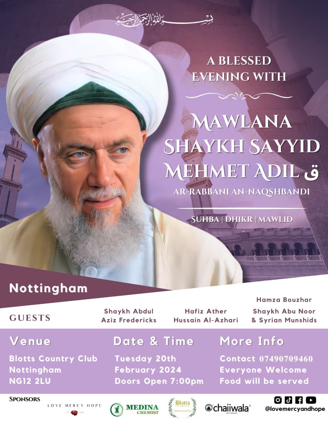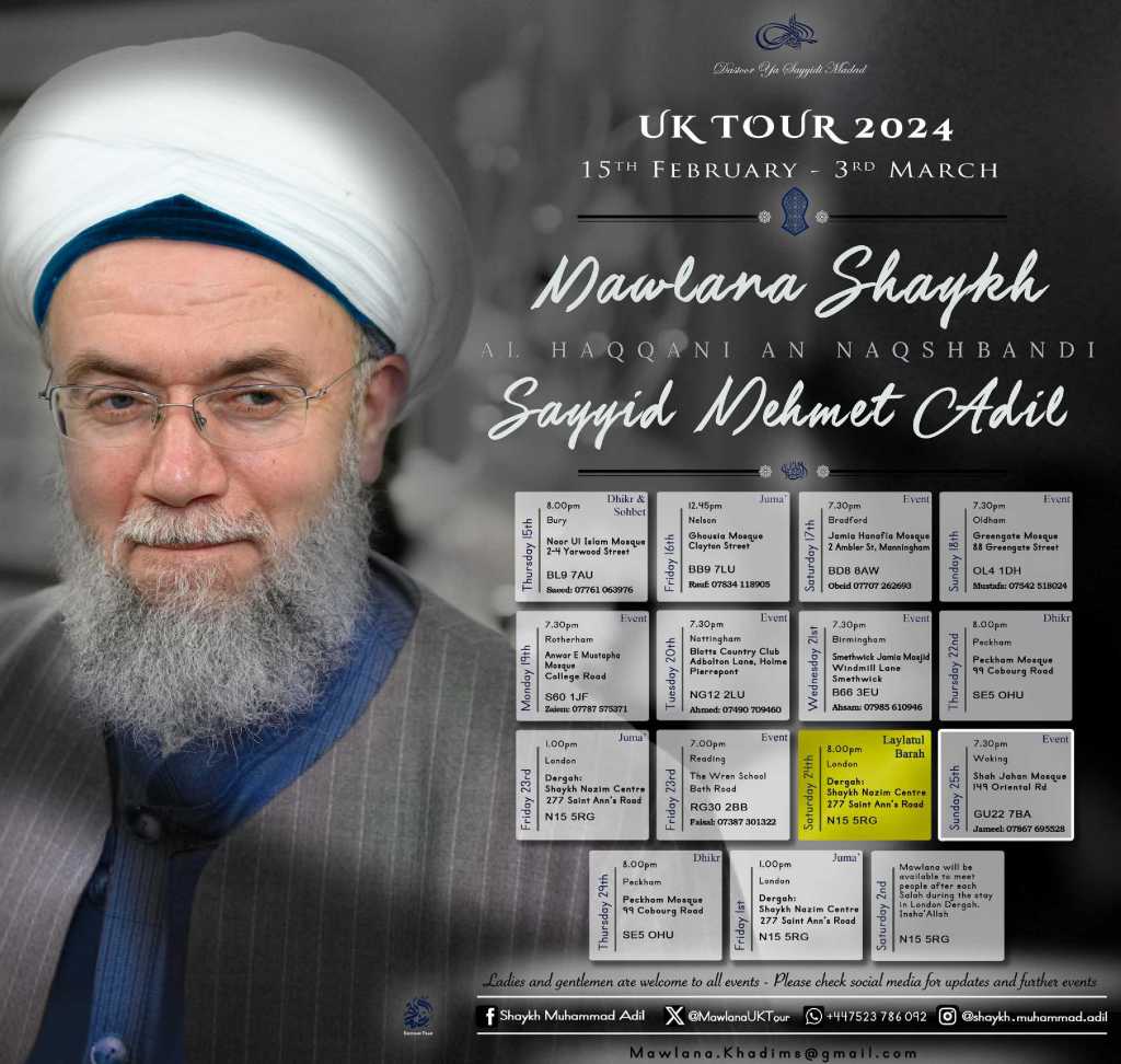 Alhamdulillah Mawlana Shaykh Sayyid Muhammad Adil ق will be visiting the UK from 15th February – 3rd March 2024 inshaAllah.