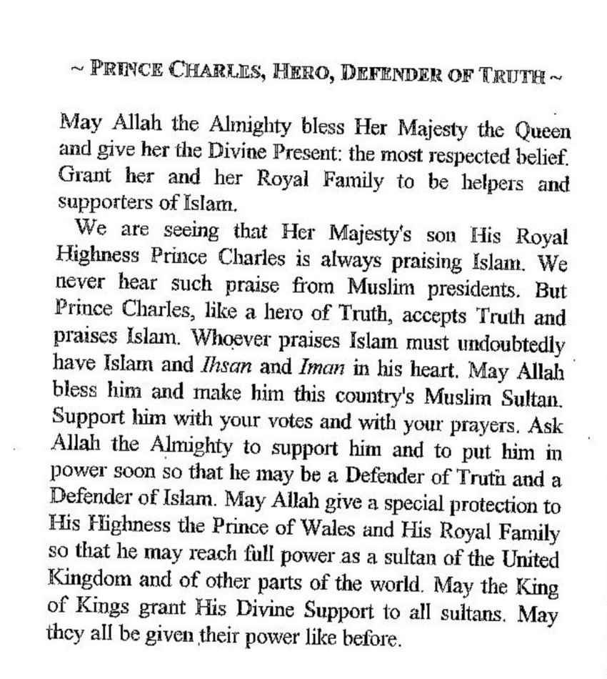 But I think that, bring it to me, what is written here? It says, “Text of Address Given by his Royal Highness the Prince of Wales, Patron of the Oxford Centre for Islamic Studies.” This speech is a proof, an evidence that Prince Charles really embraced Sufism and Islam, in his heart. But now many people are attacking him, those who are declare their belief only with their tongues, not through their hearts.