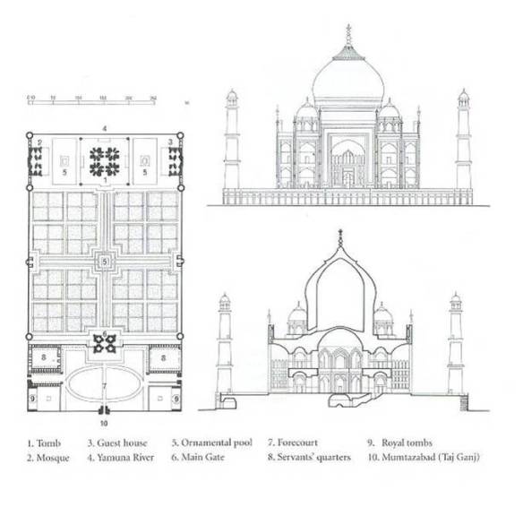 As a series of “spatial pulses” they embody in a repetitive manner the same underlying spatial order and reveal similar spatial characteristics. An architectural composition that is concentrically ordered may also comprise a multitude of centers, but usually varying degrees of importance can be distinguished. A geometrical analysis of the plan and form of Taj Mahal, for example, shows how the central space is distinguished in size and articulations from the other similar but smaller spaces, which nonetheless reveal the same underlying spatial order as the whole.