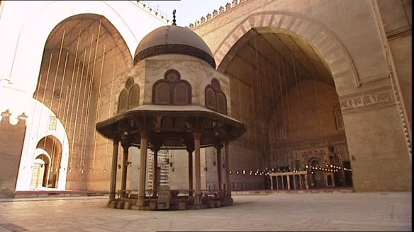 The courtyard of the Sultan Hasan school in Cairo showing the geometry and spatial order of the centralized open courtyard model.