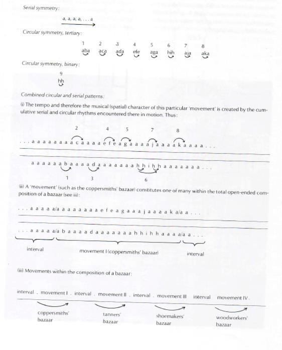 Traditional architecture captures space through geometric forms. Traditional music relates to melodies (gushah-ha} rather than scales (that is, space rather than shape) as the framework of a composition. By symmetrically repeating the forms in serial or circular order, a moving architecture is created that reads like a musical composition. Serial or binary forms balance and succeed each other in arithmetical proportion, as seen in the symmetry of the dependent spaces along the route of the bazaar.