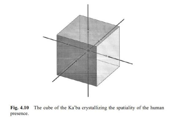 In this the Ka’ba become a true expression of the creative relationship between hidden triplicity and manifest quadrature, the triplicity of the divine command (al-amr al-ilâhi) and the quadrature of universal manifestation (al-zuhür al-kulli). The concealed triplicity complements the revealed quadrature in the form of the Ka’ba, in the same way in which spirituality complements materiality in cosmogony, and essentiality complements substantiality in manifestation. Thus this productive relationship that was first revealed through the inherent nature of the intermediary world of al-barzakh, and then manifested in various modes at different cosmic and human levels, is ultimately crystallized in the architectural form of the Ka’ba.