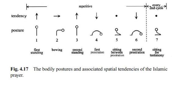 Islamic prayer comprises a prescribed set of gestures and recitations, performed in the same way individually or collectively while standing at a fixed point in space. It involves a series of bodily postures rhythmically re-peated in one place with no processional rituals.