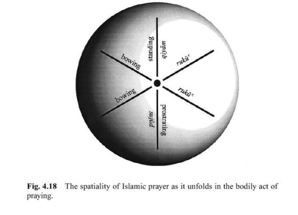 Accordingly, by the tendencies of their bodily movements, a Muslim in prayer unfolds—in principle—a sphere that defines the spatiality of the boundless bubble of their acoustic field. Ibn ‘Arabï describes an experience he once had in a prayer wherein he visualized himself as being transformed into intense light wherein he could no longer distinguish his directions.
