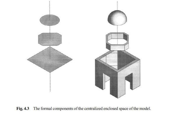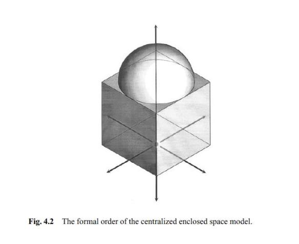Geometrically, a centralized enclosed space develops from a regular polygon (mostly quadrangular); spatially, it expands from a focal point and evolves symmetrically about a central axis, resulting in a balanced synthesis in all di-rections. The simplest architectural embodiment of this model is a building with a cubical base and a hemispherical dome.