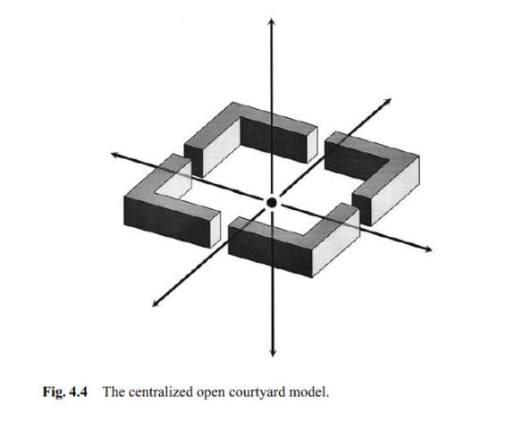 The second form of concentric composition is the centralized open courtyard. It represents all confined, unroofed spaces that are organized symmetrically about a central point. The geometrical order of this composition reveals, like the previous model, the geometrical proliferation of unity into quadrature. The defining surfaces are usually symmetrically articulated in relation to a central axis, leading to a balanced deployment of space in all directions. Far from being merely a negative space, the open courtyard forms an integral and major part of many architectural compositions. In many cases it even forms the major space of which the building is the defining parameter.