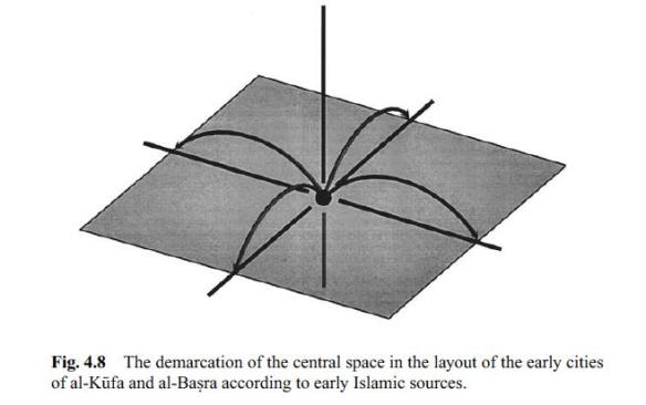 The planning of some of the early Islamic cities, such as al-Kufa, al-Basra, and Baghdad also follow the model of a centralized open courtyard. As described by Muslim chroniclers, they were laid out around a large open court (sahn) centered by one or two buildings—a mosque in al-Kufa and al-Basra and a mosque and the caliph’s palace in Baghdad, revealing the same underlying spatial order at a larger urban scale.