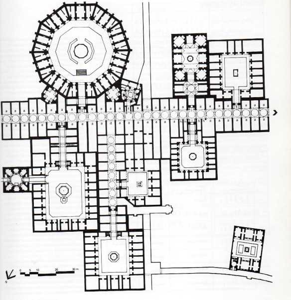 Occasionally you come upon another kind of opening, and this leads to nodal spaces. Nodal outdoor spaces, as seen in the caravanserai which sterns from the primary movement system, are essentially rooms around a courtyard. Nodal indoor spaces, as seen in the timchah, are essentially rooms around a covered courtyard; there is usually a centra] pool, and the roof often has an open oculus.