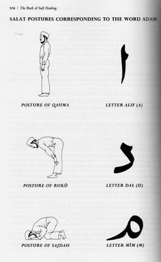 The postures of prayer are also viewed to correspond to the form of the Arabic letters. The standing posture corresponds to the letter alif(A), whose verticality is seen to represent the original position from which other postures derive. Calligraphically, the straightness of the alif is taken to represent the principal form of the various curvatures and bending of other letters.