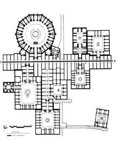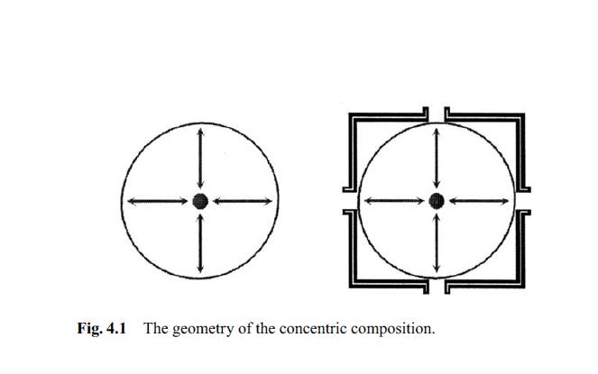 The second form of concentric composition is the centralized open courtyard. It represents all confined, unroofed spaces that are organized symmetrically about a central point. The geometrical order of this composition reveals, like the previous model, the geometrical proliferation of unity into quadrature. The defining surfaces are usually symmetrically articulated in relation to a central axis, leading to a balanced deployment of space in all directions. Far from being merely a negative space, the open courtyard forms an integral and major part of many architectural compositions. In many cases it even forms the major space of which the building is the defining parameter.