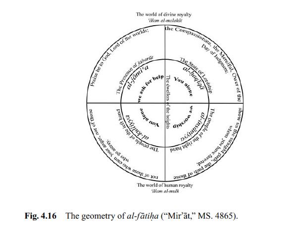 This mode of reasoning constructs, on the one hand, causal links between the principle and its manifestations and, on the other, correspondences between different worlds and modes of being based on the inherent order that binds all principles to their respective worlds. As we have seen, the whole of Sufi cos-mology is motivated by a passion to understand how the world unfolded from its primordial principle. This quest for principles is central to our understanding of what shaped the spatial sensibility and sense of ordering of premodern Muslims. From the third century onward, Euclidian geometry and Ptolemaic astronomy prevailed in the Islamic world. As these sciences were themselves underpinned by a quest for principles, it is necessary to understand the scientific frame of geometrical imagining that legitimated Sufi cosmological and cosmogonic interpretations.