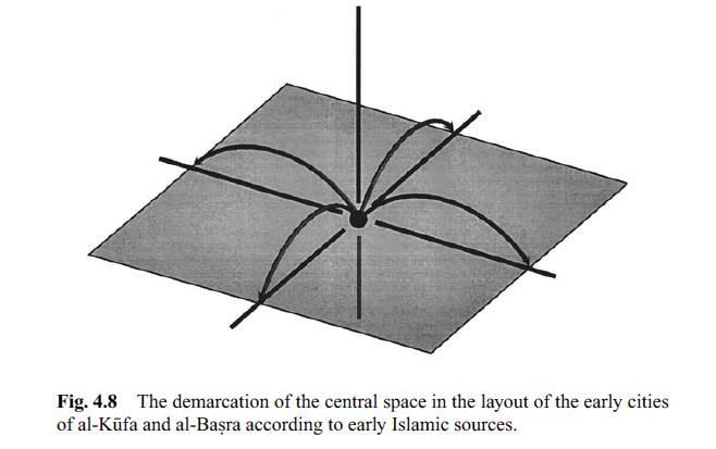 The planning of some of the early Islamic cities, such as al-Kufa, al-Basra, and Baghdad also follow the model of a centralized open courtyard. As described by Muslim chroniclers, they were laid out around a large open court (sahn) centered by one or two buildings—a mosque in al-Kufa and al-Basra and a mosque and the caliph’s palace in Baghdad, revealing the same underlying spatial order at a larger urban scale.