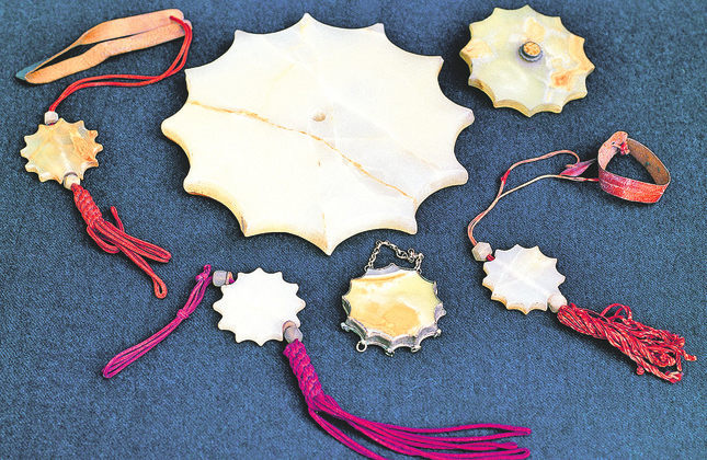 As mentioned above, when fixed to the girdle of a dervish or tied across his stomach, the eight- or seven-sided sacred stone of the Qalandars is called palheng tas. If it is smaller, with usually twelve (sometimes eight or seven) sides and worn by a Bektashi dervish on his neck, close to the heart, it is called teslim tas (Plate 12.2).