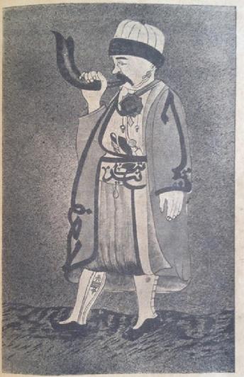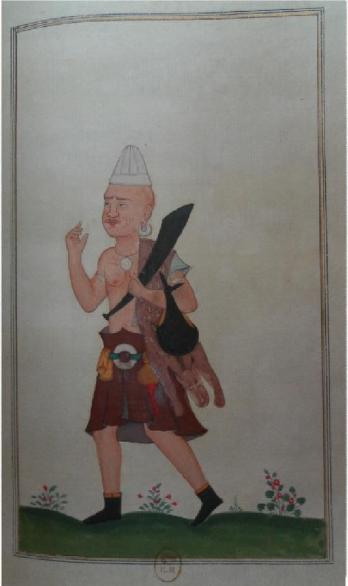 ( “Il avoit la teste toute nuë et rasée; Ie reste du corps étoit aussi nud, á la réserve d’un morceau de serge blanche, qu’ il avoit sur les épaules, et d’une peau de cuir de couleur minime, qui le couvroit depuis le bas-ventre jusqu’environ les genoux. Cette peau étoit serrée d’une ceinture de cuir, qui lioit au milieu de son ventre une pierre plate octogone de couleur d’alun à peu pres (…) Je fis ce que je pils pour savoir de luy la cause pour laquelle il s’habilloit de cette sorte, et ce que vou-loient dire ces pierres qu’il portoit sur son ventre et I son oreille; il me répondit, que c’estoit-lá de grands mystères...”; Nau, M., Voyage nouveau de la Terre sainte, Paris, in J. Barbou, 1679, edition, 1757, p. 514.)