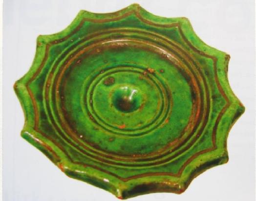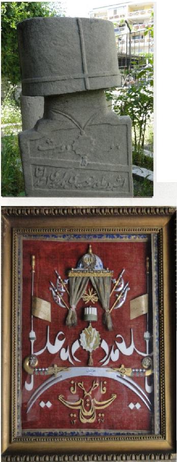 It is especially present in the architecture, for example at the top of the main gates of the Bektashi lodges, on their fountains and walls, on the grave stones of the Bektashi dervishes, etc. (Plate 14.1)’ It is also drawn in Bektashi calligraphies and on manuscripts in composition with other symbols (Plate 14.2), as well as some objects of day-to-day life, like tea or coffee cups, plates (Plate 15.1); jewellery and medals are also made in the form of this stone. It is also worth noting that the stone is quite venerated by the members of other Turkish Sufi orders, especially by Rifái and Halveti-Misriye.’ It is known, for instance, that several Rifái medals and calligraphies mingle the teslim tas with their own symbols. The stone has finally become a talisman (tidsim), printed on paper or cloth, a phenomenon that has extended its influence beyond the Sufi milieu to the whole of the Turkish society.