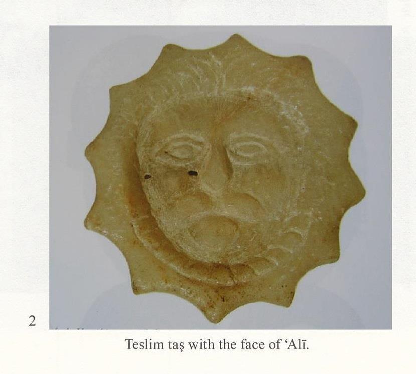 Noyan also argues that the outer face of the stone refers to Khadija, the wife of the Prophet, and the inner face to his daughter Fátima, wife of ‘Ali; this is the reason why the wife of a Bektashi shaikh can wear the stone. We also know a very rare teslim tas as an object which in its outer side shows a carved face of a person who is most probably “the Lion ‘Ali”