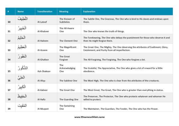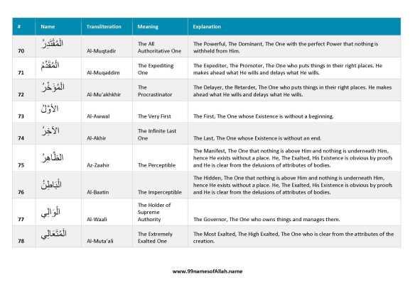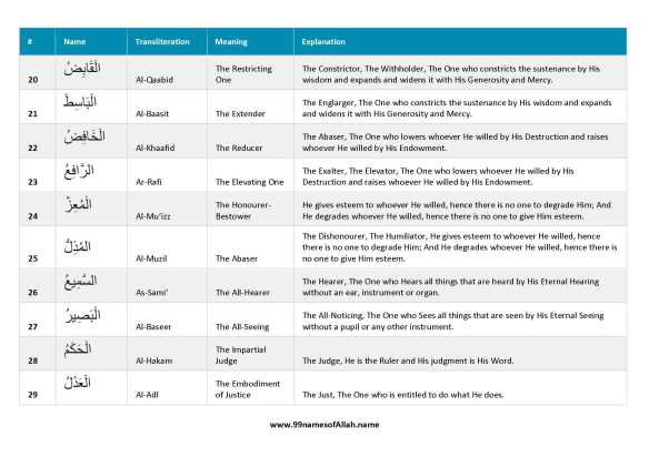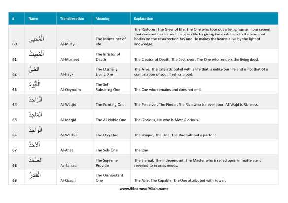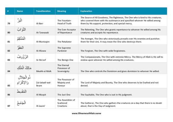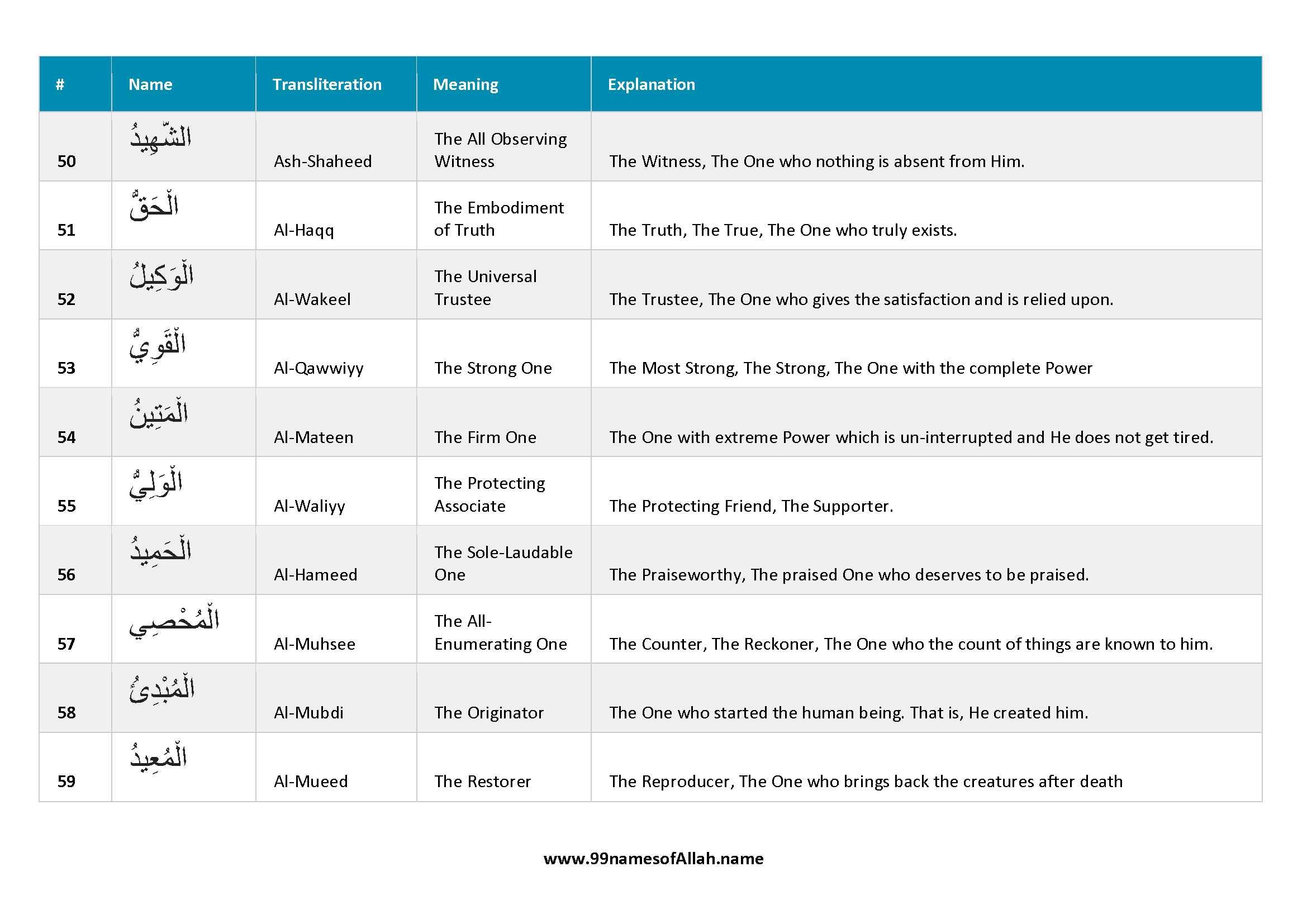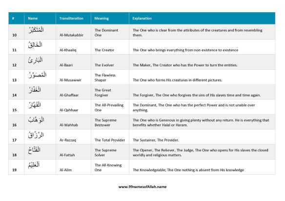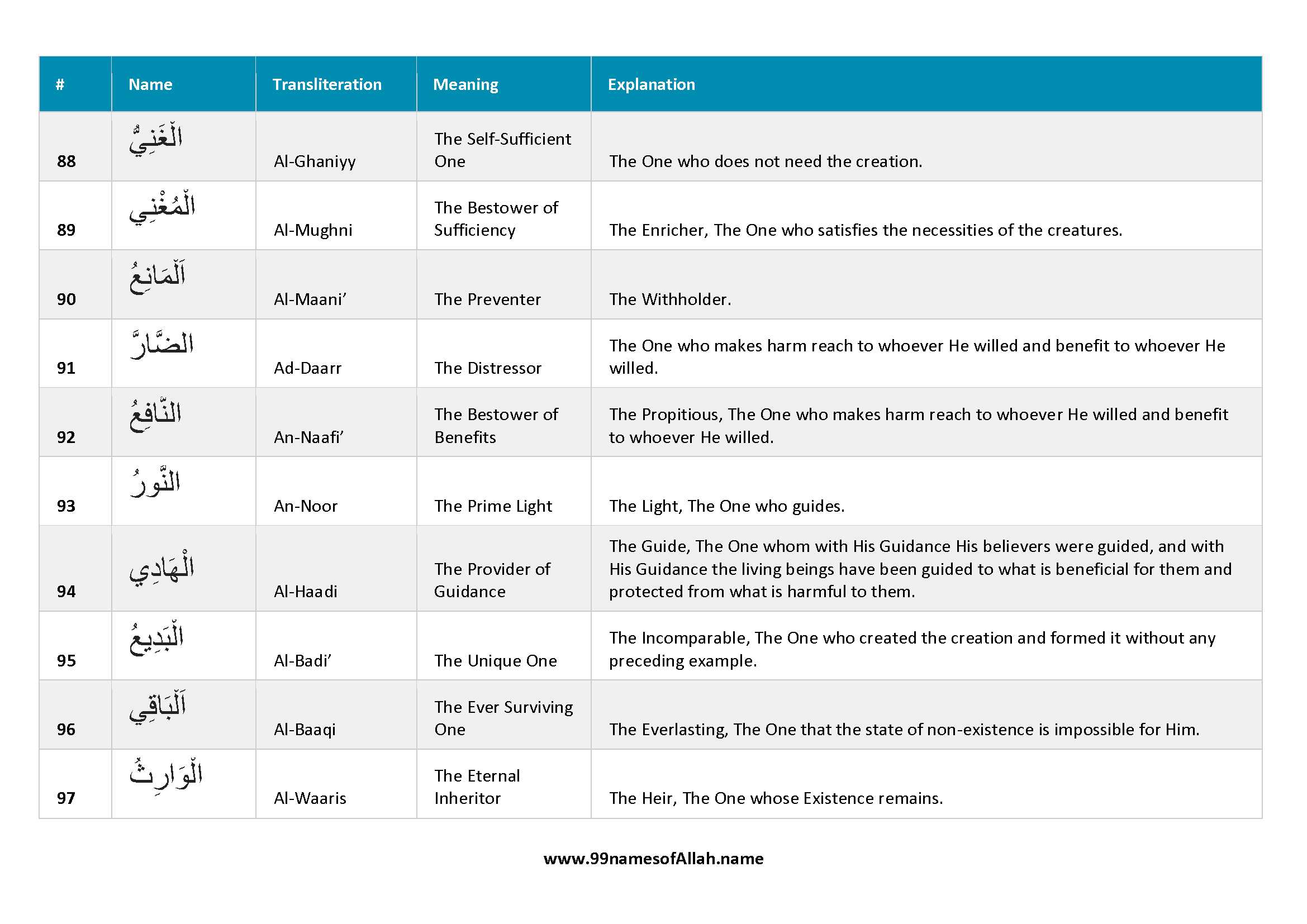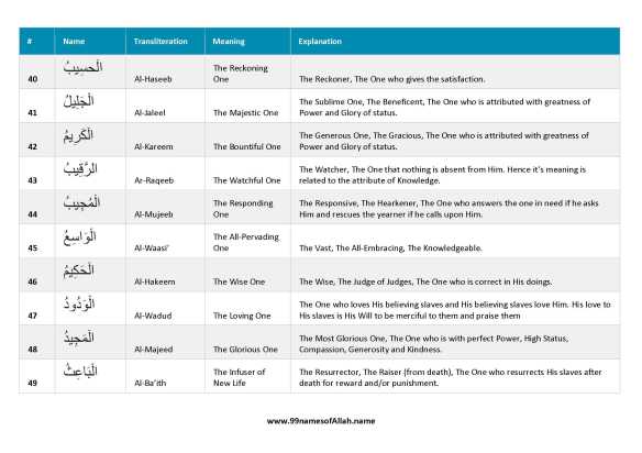 1 Ar-Rahman (الرحمن) The All-Compassionate 2 Ar-Rahim (الرحيم) The All-Merciful 3 Al-Malik (الملك) The Absolute Ruler 4 Al-Quddus (القدوس) The Pure One 5 As-Salam (السلام) The Source of Peace 6 Al-Mu’min (المؤمن) The Inspirer of Faith 7 Al-Muhaymin (المهيمن) The Guardian 8 Al-Aziz (العزيز) The Victorious 9 Al-Jabbar (الجبار) The Compeller 10 Al-Mutakabbir (المتكبر) The Greatest 11 Al-Khaliq (الخالق) The Creator 12 Al-Bari’ (البارئ) The Maker of Order 13 Al-Musawwir (المصور) The Shaper of Beauty 14 Al-Ghaffar (الغفار) The Forgiving 15 Al-Qahhar (القهار) The Subduer 16 Al-Wahhab (الوهاب) The Giver of All 17 Ar-Razzaq (الرزاق) The Sustainer 18 Al-Fattah (الفتاح) The Opener 19 Al-`Alim (العليم) The Knower of All 20 Al-Qabid (القابض) The Constrictor 21 Al-Basit (الباسط) The Reliever 22 Al-Khafid (الخافض) The Abaser 23 Ar-Rafi (الرافع) The Exalter 24 Al-Mu’izz (المعز) The Bestower of Honors 25 Al-Mudhill (المذل) The Humiliator 26 As-Sami (السميع) The Hearer of All 27 Al-Basir (البصير) The Seer of All 28 Al-Hakam (الحكم) The Judge 29 Al-`Adl (العدل) The Just 30 Al-Latif (اللطيف) The Subtle One 31 Al-Khabir (الخبير) The All-Aware 32 Al-Halim (الحليم) The Forbearing 33 Al-Azim (العظيم) The Magnificent 34 Al-Ghafur (الغفور) The Forgiver and Hider of Faults 35 Ash-Shakur (الشكور) The Rewarder of Thankfulness 36 Al-Ali (العلى) The Highest 37 Al-Kabir (الكبير) The Greatest 38 Al-Hafiz (الحفيظ) The Preserver 39 Al-Muqit (المقيت) The Nourisher 40 Al-Hasib (الحسيب) The Accounter 41 Al-Jalil (الجليل) The Mighty 42 Al-Karim (الكريم) The Generous 43 Ar-Raqib (الرقيب) The Watchful One 44 Al-Mujib (المجيب) The Responder to Prayer 45 Al-Wasi (الواسع) The All-Comprehending 46 Al-Hakim (الحكيم) The Perfectly Wise 47 Al-Wadud (الودود) The Loving One 48 Al-Majid (المجيد) The Majestic One 49 Al-Ba’ith (الباعث) The Resurrector 50 Ash-Shahid (الشهيد) The Witness 51 Al-Haqq (الحق) The Truth 52 Al-Wakil (الوكيل) The Trustee 53 Al-Qawiyy (القوى) The Possessor of All Strength 54 Al-Matin (المتين) The Forceful One 55 Al-Waliyy (الولى) The Governor 56 Al-Hamid (الحميد) The Praised One 57 Al-Muhsi (المحصى) The Appraiser 58 Al-Mubdi’ (المبدئ) The Originator 59 Al-Mu’id (المعيد) The Restorer 60 Al-Muhyi (المحيى) The Giver of Life 61 Al-Mumit (المميت) The Taker of Life 62 Al-Hayy (الحي) The Ever Living One 63 Al-Qayyum (القيوم) The Self-Existing One 64 Al-Wajid (الواجد) The Finder 65 Al-Majid (الماجد) The Glorious 66 Al-Wahid (الواحد) The Unique, The Single 67 Al-Ahad (الاحد) The One, The Indivisible 68 As-Samad (الصمد) The Satisfier of All Needs 69 Al-Qadir (القادر) The All Powerful 70 Al-Muqtadir (المقتدر) The Creator of All Power 71 Al-Muqaddim (المقدم) The Expediter 72 Al-Mu’akhkhir (المؤخر) The Delayer 73 Al-Awwal (الأول) The First 74 Al-Akhir (الأخر) The Last 75 Az-Zahir (الظاهر) The Manifest One 76 Al-Batin (الباطن) The Hidden One 77 Al-Wali (الوالي) The Protecting Friend 78 Al-Muta’ali (المتعالي) The Supreme One 79 Al-Barr (البر) The Doer of Good 80 At-Tawwab (التواب) The Guide to Repentance 81 Al-Muntaqim (المنتقم) The Avenger 82 Al-‘Afuww (العفو) The Forgiver 83 Ar-Ra’uf (الرؤوف) The Clement 84 Malik-al-Mulk (مالك الملك) The Owner of All 85 Dhu-al-Jalal wa-al-Ikram (ذو الجلال و الإكرام) The Lord of Majesty and Bounty 86 Al-Muqsit (المقسط) The Equitable One 87 Al-Jami’ (الجامع) The Gatherer 88 Al-Ghani (الغنى) The Rich One 89 Al-Mughni (المغنى) The Enricher 90 Al-Mani'(المانع) The Preventer of Harm 91 Ad-Darr (الضار) The Creator of The Harmful 92 An-Nafi’ (النافع) The Creator of Good 93 An-Nur (النور) The Light 94 Al-Hadi (الهادي) The Guide 95 Al-Badi (البديع) The Originator 96 Al-Baqi (الباقي) The Everlasting One 97 Al-Warith (الوارث) The Inheritor of All 98 Ar-Rashid (الرشيد) The Righteous Teacher 99 As-Sabur (الصبور) The Patient One