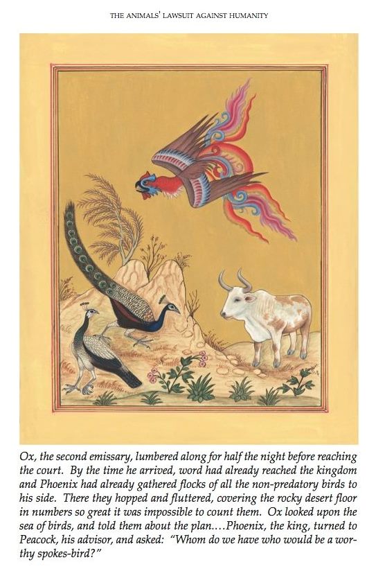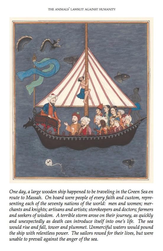 The story is that there once was a place on Earth, an island called Tsagone, where the animals lived happily and free from persecution by human beings; the Isle was ruled over by Bersaf, King of the Spirits. But a ship carrying passengers was wrecked near its shores and a large group of people clambered onto the island. Quite soon, perhaps inevitably, the people began to use the animals and birds for food and labour, and in fact enslaved them: so for the animals, “eyes that were once filled with trust began to be drowned in stormy oceans of fear.” Eventually the animals, in desperation, met and agreed to ask the King of Spirits for help. He decided to summon the humans to court to answer the charges which were beginning to be specified by the animals. The humans were strongly divided. Hochmah (Wisdom), the female sage, was in favour of the animals’ case. Zadone (Malice) however was the spokesperson for the humans and led their case in their representation to the King. He argued, in relation to species other than human: “We say they are our slaves and we shall seize those whom we wish and treat them just as we would treat any other possession. Those who submit to us accept the notion that the Creator set us to rule over them— but those who break our yoke and flee—they are rebelling against God’s word…the consequences are theirs.” The humans also maintained that they were the only creatures who had souls, consciences and understanding and that they had the most perfect bodies in all Creation. The King of Spirits, after wise advice, ordered a full investigation based on evidence and asked both humans and animals to bring together their evidence.