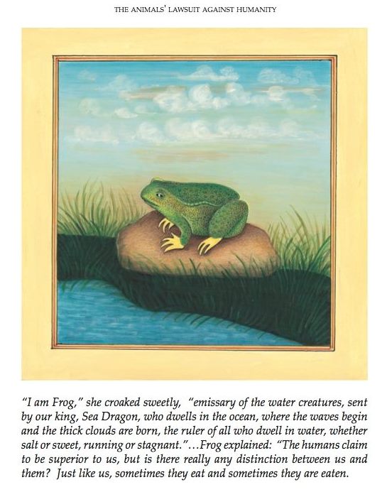 The story is that there once was a place on Earth, an island called Tsagone, where the animals lived happily and free from persecution by human beings; the Isle was ruled over by Bersaf, King of the Spirits. But a ship carrying passengers was wrecked near its shores and a large group of people clambered onto the island. Quite soon, perhaps inevitably, the people began to use the animals and birds for food and labour, and in fact enslaved them: so for the animals, “eyes that were once filled with trust began to be drowned in stormy oceans of fear.” Eventually the animals, in desperation, met and agreed to ask the King of Spirits for help. He decided to summon the humans to court to answer the charges which were beginning to be specified by the animals. The humans were strongly divided. Hochmah (Wisdom), the female sage, was in favour of the animals’ case. Zadone (Malice) however was the spokesperson for the humans and led their case in their representation to the King. He argued, in relation to species other than human: “We say they are our slaves and we shall seize those whom we wish and treat them just as we would treat any other possession. Those who submit to us accept the notion that the Creator set us to rule over them— but those who break our yoke and flee—they are rebelling against God’s word…the consequences are theirs.” The humans also maintained that they were the only creatures who had souls, consciences and understanding and that they had the most perfect bodies in all Creation. The King of Spirits, after wise advice, ordered a full investigation based on evidence and asked both humans and animals to bring together their evidence.